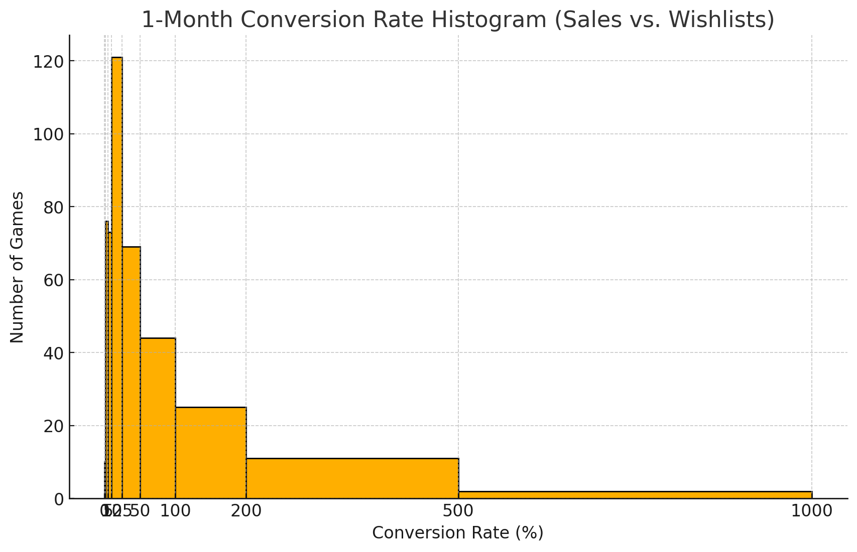Overall, while many games struggle to convert even a quarter of their wishlist base within a month, a noteworthy fraction (9%) do surpass their own wishlist numbers. The data suggests that continued attention and improvements after launch can be pivotal in translating wishlists into sales over time.